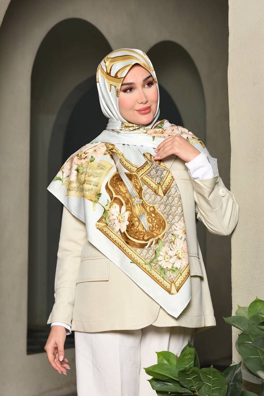 روسری ابریشم ژاکارد وارداتی آبی کرم طلایی